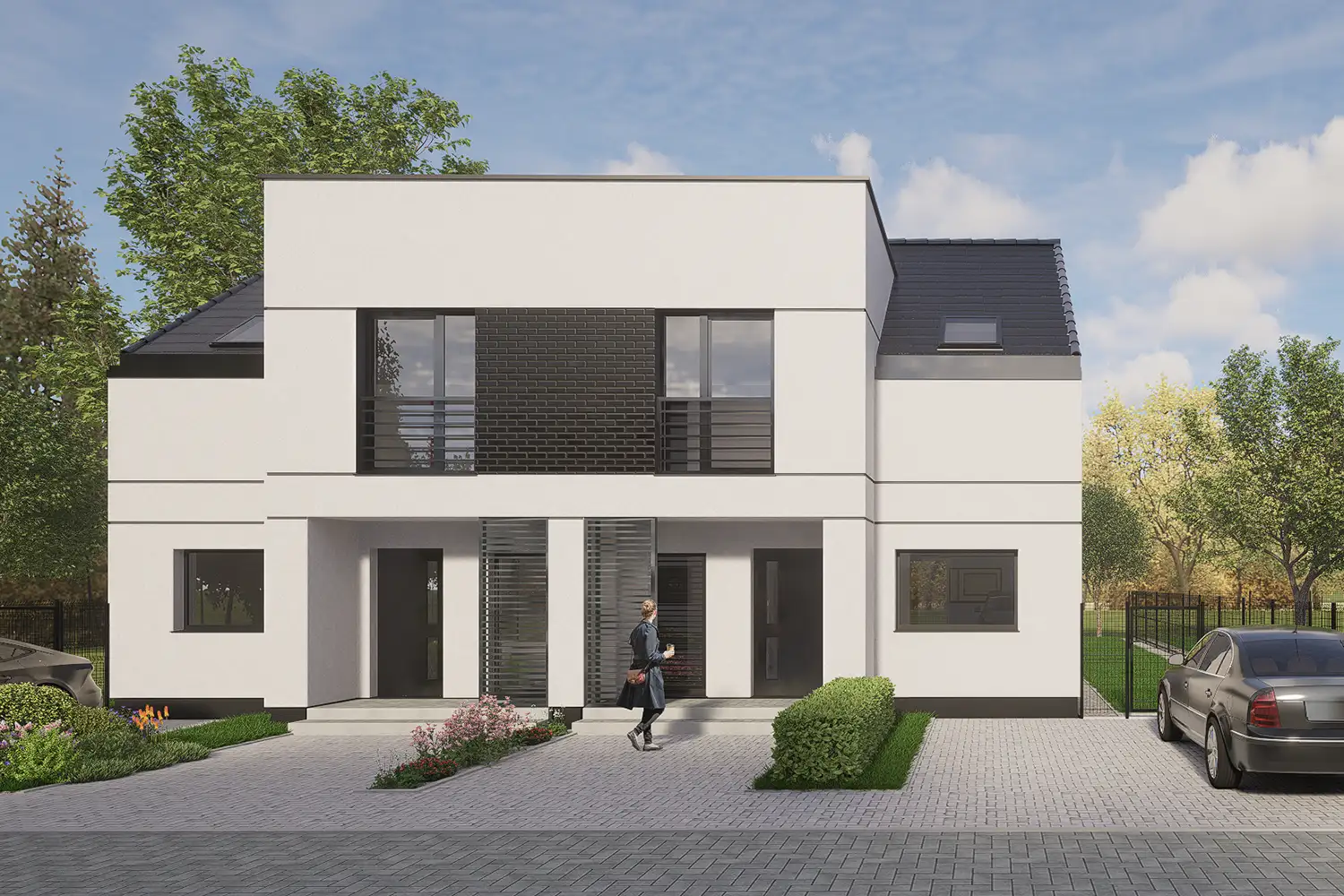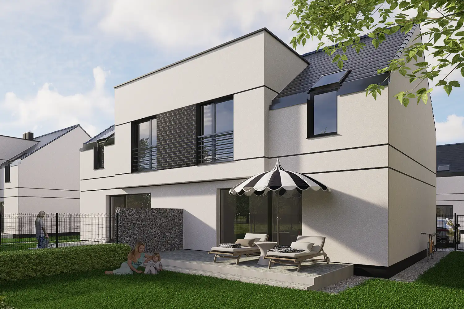 Agis to piętrowy dom pasywny w zabudowie bliźniaczej. Dzięki zastosowaniu nowoczesnych rozwiązań technologicznych ma niskie zapotrzebowanie na energię cieplną, a przez to gwarantuje niskie koszty eksploatacji.